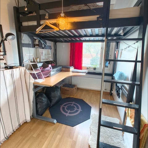 Siisti metallinen parvisänky, mitat viimeisessä kuvassa. Sängyn alla pöytälevy. Pöytälevystä puuttuu keskeltä yksi kiinnike, mutta tämä ei ole vaikuttanut meillä käyttöön mitenkään. Käytön jälkeä voi olla, mutta yleisilmeeltään erittäin siisti. Netissä kokoamisohjeet.