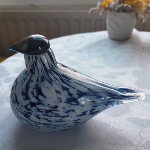 Sininen käsintehty lasilintu, kultauksilla.
