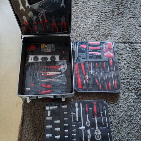 Kuvien mukaiset pinottavat kolme työkalulaatikkoa työkaluineen. Kaikki käyttämättömiä. hinta koko paketille 470.