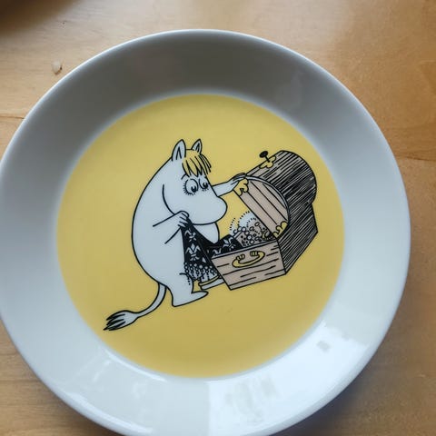 Myydään hyväkuntoinen (lautasta käytetty jonkin verran, mukia ei juurikaan) Niiskuneiti-astiasto. Kaksikahvaisen mukin tilavuus 2 dl, lautasen halkaisija 18 cm.