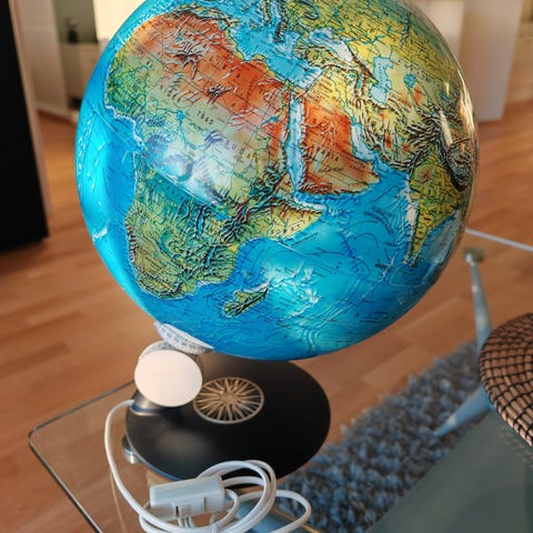 Valaisinmaapallo, joka on valmistettu Tanskassa. Siinä on yksityiskohtainen kartta ja se toimii 25 watin lampulla. Maapallo on kiinnitetty mustaan jalustaan ja siinä on virtajohto kytkimellä.