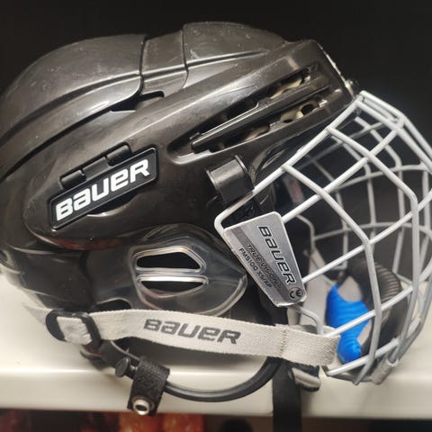 Bauer jääkiekkokypärä. Kasvoristikko. Säädettävä istuvuus ja pehmusteet sisäpuolella. Ehjä ja hyväkuntoinen.