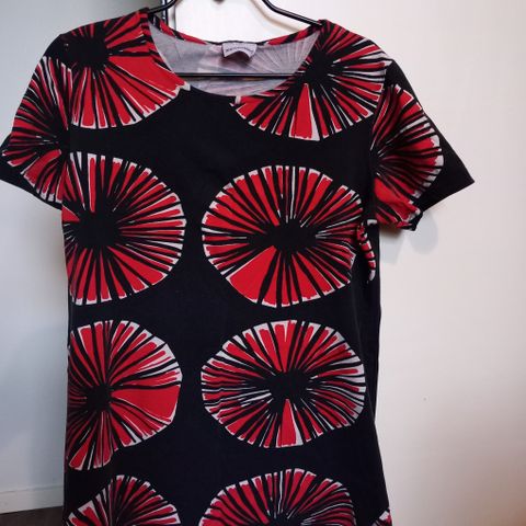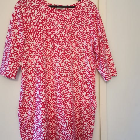 3/4-hihainen Marimekon Varpu vikuri, jonka kainalo-kainalo -mitta on 56 cm olalta helmaan 94 cm. Materiaali puuvillatrikoota eli joustaa hieman. Pidetty vain muutamia kertoja eikä kunnossa ole mitään moitittavaa.
