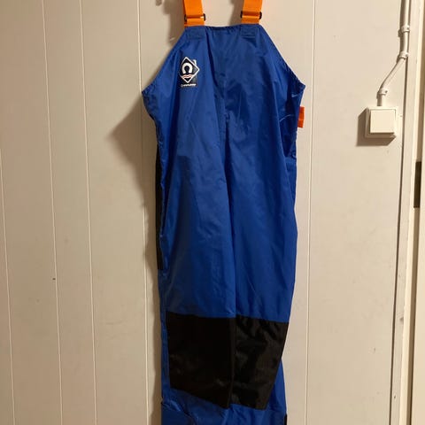 Mustat tekniset housut/haalari purjehdukseen. Sopivat varamaan noin 150 cm pituiselle. Säädettävät henkselit ja kiristettävät lahkeet. Vyötäröllä kuminauha. Vedenpitävät ja tuulenpitävät. Vahvistuskangassa polvissa ja istuimessa. Vähän kulumaa/pinttymää polvissa, toisen henkselin kuminauha vähän virttynyt, toimii silti hyvin. Muuten ehjät, kangas itsessään täysin ehjä.