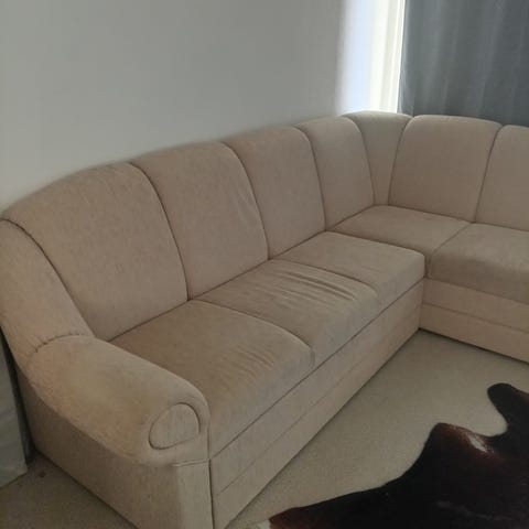 Siisti kulmasohva pientä nukkaantumista, en putsaile enempää karvoja varmasti löytyy. Nouto Otavasta ja omat kantajat!