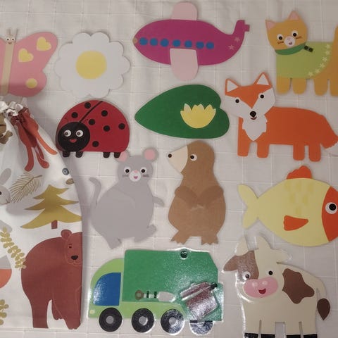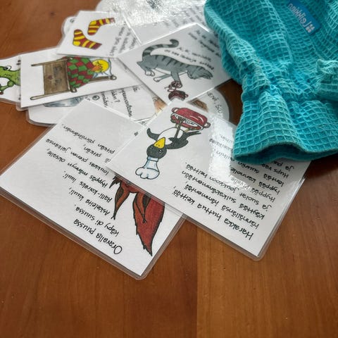 Uusi lorupussi. Sisältää 14 lorukorttia. Kortin kuva liittyy loruun. Kortit on kartonkia ja päällystetty kontaktimuovilla.