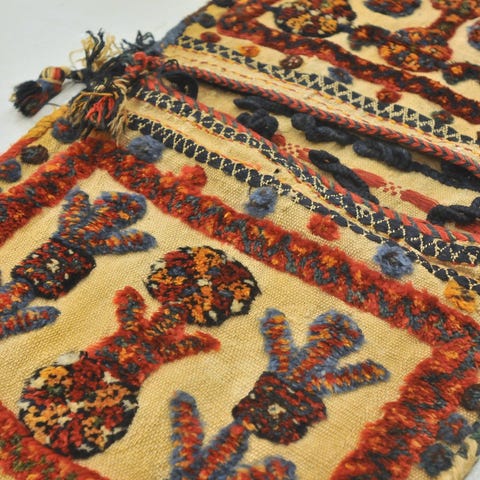 Erityistä: Laukku on perinteinen suolalaukku, ”namakdan”, jossa on kapea suuaukko. Kasvivärein värjätty villa, jossa upeat sävyt. Semiantiikkinen keräilykappale.