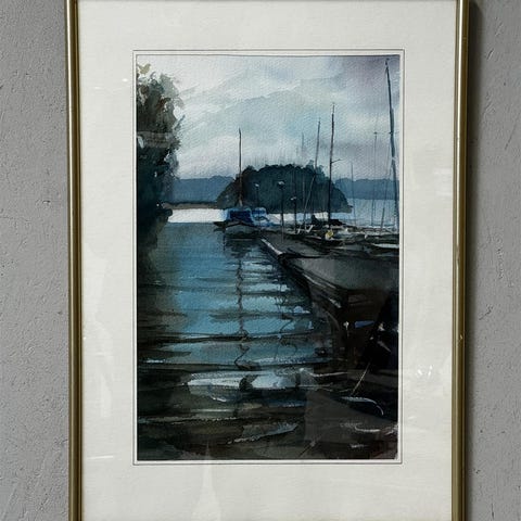 Akvarellimaalaus, jossa on satamanäkymä. Teoksessa näkyy veneitä laiturissa, vedenpintaa sekä taustalla rakennuksia ja kupolikattoinen rakennus. Värimaailma on harmaan, ruskean, sinisen ja oranssin sävyinen. Maalaus on tehty paperille pystysuuntaisena. Sopii esimerkiksi seinätauluksi sisustukseen.
