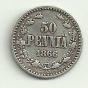 Suomen 50 penniä hopearaha vuodelta 1890. Kolikossa on toisella puolella arvomerkintä 50 penniä ja vuosiluku 1890 sekä lehtikuviointi. Kääntöpuolella on kaksipäinen vaakuna-aiheinen kotka. Metallina hopea tai hopeaseos, reunus helmikuvioitu. Sopii esimerkiksi keräilyyn tai kokoelman täydennykseksi. Rahamestarin L kirjan vinossa? hinta 5 e posti 2.50 e