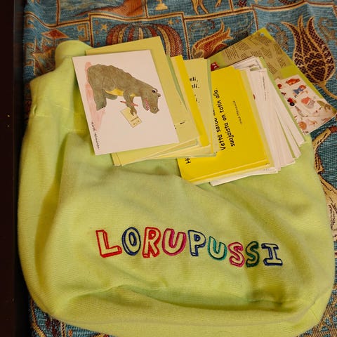 Uusi lorupussi. Sisältää 14 lorukorttia. Kortin kuva liittyy loruun. Kortit ovat kartonkia ja päällystetty kontaktimuovilla.