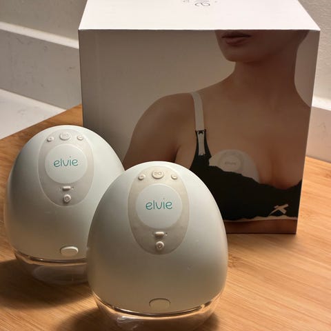 Elvie sähkökäyttöinen rintapumppu, kaksoispumppumalli. Pumput ovat kompaktin kokoisia ja suunniteltu käytettäväksi rintaliivien sisällä. Laitteissa on läpinäkyvät maidonkeräysastiat ja valkoiset pumppuosat. Sopii rintamaidon pumppaamiseen kotona tai liikkeellä. Pakkaus sisältää kaksi pumppua ja alkuperäisen laatikon kuvineen.