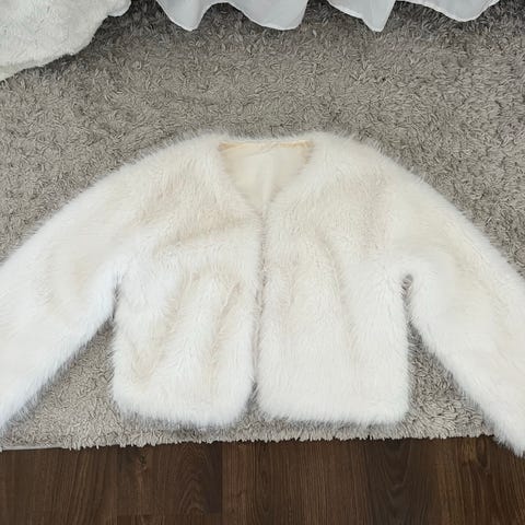 Myydään valkoinen tekoturkistakki, jonka koko on S. Siinä on vetoketju ja huppu. Takin sisäpuoli on kaunista, valkoista vuorikangasta.