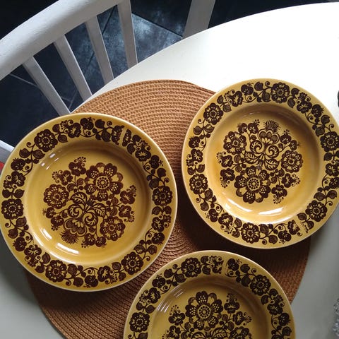 Nättejä retro lautasia kaupan. Lautasten halkaisija on noin 13.5cm. Lautasten pinta on röpelöinen ja hieman roiskemainen. Lautasia on neljä pinkkiä, neljä turkoosia ja yksi väritön. Yhden turkoosin reunasta todella pieni lohkeama.