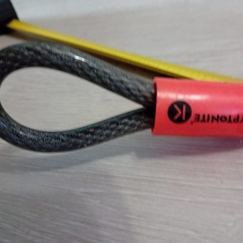 Kryptonite vaijerilukko, pituus noin 120 cm. Teräsvaijeri, jossa silmukkapäät molemmissa päissä. Vaijerissa muovipäällyste ja punaiset suojaholkit. Soveltuu esimerkiksi polkupyörän tai muun omaisuuden lukitsemiseen yhdessä erillisen lukon kanssa.
