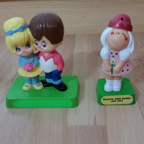 Tyttöfiguuri vuodelta 1971. Edessä tarra "penni ajatuksestasi".