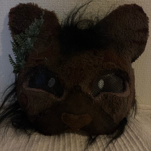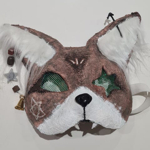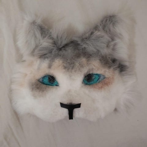 Mustaliila kissamaski. Maski on päällystetty huovalla johon maalattu yksityiskohtia ja korvissa sekä poskissa on karvaa. Silmät ovat tehty maalatusta verkosta josta näkee hyvin läpi.