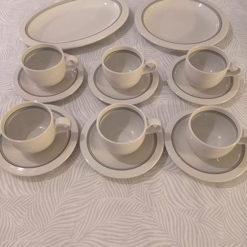 11 kahvikuppia ja -lautasta, sekä sokerikko. (Kermakko saattaa vielä löytyä, jos löytyy niin muokkaan ilmoitusta.)