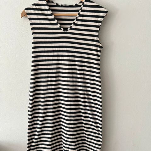 Raitatunika Marimekko kaste. Pesulapu leikattu, mutta on puuvillaa. Taskut! Musta raita ehkä enemmän tummanharmaa ( voi verrata mustaan laukkuun ) ( voi olla et on vaan asteen haalistunut pesussa ). Laukku ei sisälly.