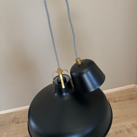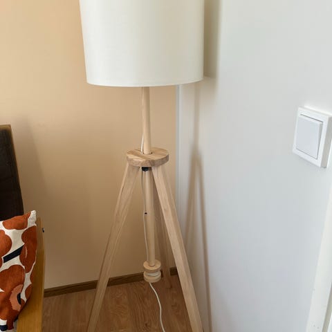 Muuten hyväkuntoinen ikea lauters lattiavalaisin, kuvassa näkyy pieni kolhu kangasosassa mutta eipä juurikaan ole haitannut kun on kääntänyt esim seinään päin ko. Kohdan.