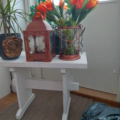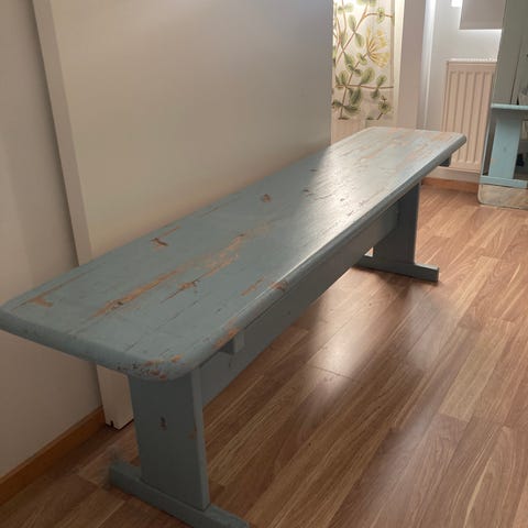 Tyylikäs penkki hyvä maali-ei tarvitse korjailla..siististä kodista..sopii moneen paikkaan...eteinen-kenkätuoliksi...ruokapöytään...kukille ym...livenä kauniimpi kuin kuva kertoo...nouto hamina-karhula
