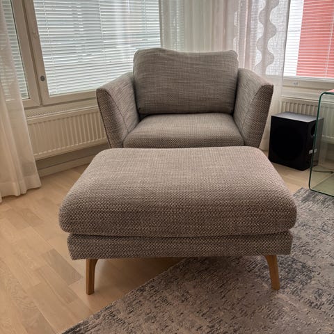 Tuoli on kuin uusi – sitä ei ole käytetty ja verhoilumateriaali on täysin uusi. Erittäin mukava ja tyylikäs, sopii hyvin niin olohuoneeseen kuin makuuhuoneeseenkin.