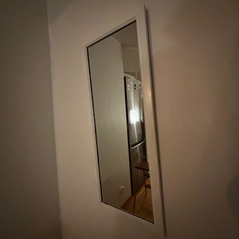 Kohtalaisessa kunnossa oleva peili, vaalea/hopeanhohtoinen puukehys.