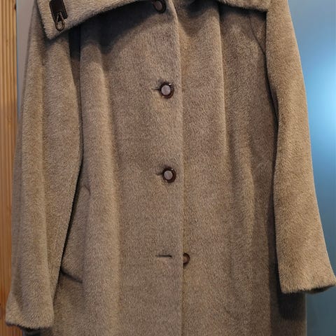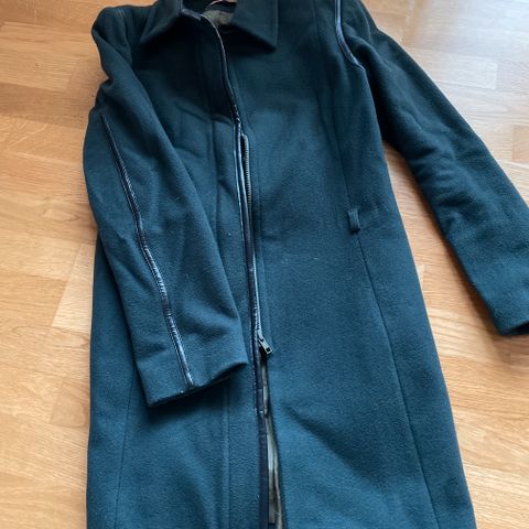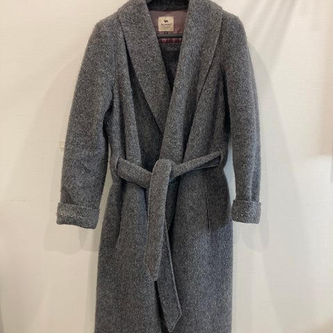 Kaunis klassinen harmaa villakangastakki 30% villaa. Kaksirivi napitus, vyö ja sisällä satiini vuorikangas. Ovh 160 e.