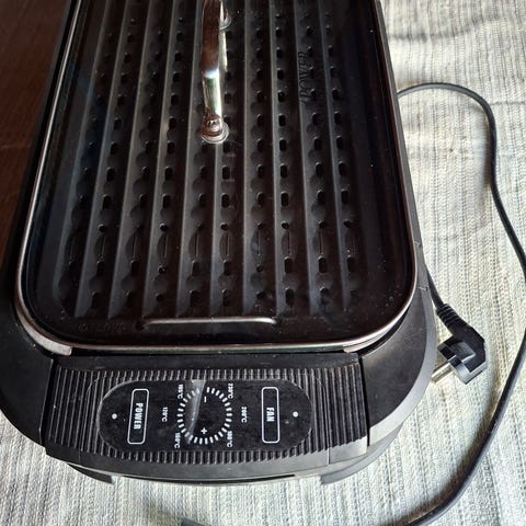 Ninja sähkögrilli ja uuni. Laitteessa on ylä- ja alalämpö, irrotettava grilliritilä sekä paistoallas. Mukana käyttöohje. Soveltuu ruoan grillaamiseen ja kypsentämiseen sisätiloissa. Väriltään musta metallisilla yksityiskohdilla.