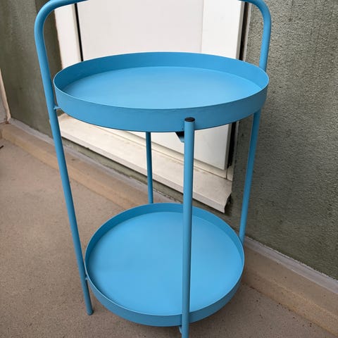 Laatikko on rikki ja poistettu. Muuten pöytä on tukeva ja toimii hyvin eteispöytänä, sivupöytänä tai sisustuspöytänä.