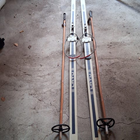Perinteisten suksien pituus on 194 cm, sauvojen 135 cm.