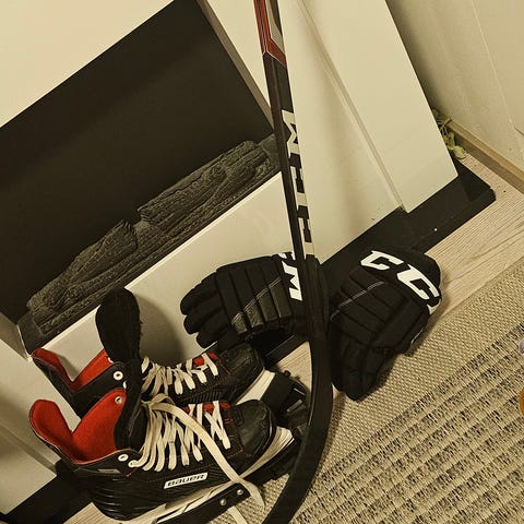 • Hanskat: Bauer Vapor. Koko 13" / 33 cm. Suosittu, kapeampi istuvuus. Hanskat ovat siistit ja ehjät.