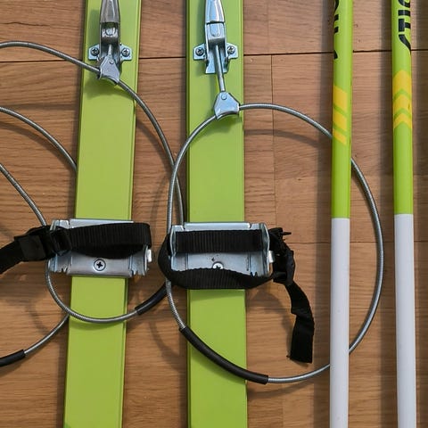 Stiga lastensukset ja sauvat. Suksien pituus on 110 cm ja väri vihreä. Mukana siteet, joissa jalkaterän päälle tuleva remmikiinnitys sekä metallinen jalan taakse. Sauvojen pituus on 85 cm, ja niissä on muoviset sommat sekä käsilenkit. Toinen sauvoista teipattu, mutta toiminut hyvin näin useamman talven.