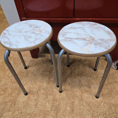 Myynnissä kaksi valkoista jakkaraa. Materiaali on todennäköisesti muovia, mutta ne ovat tukevat ja painavat – eivät mitään kevyttä tai huteraa mallia.