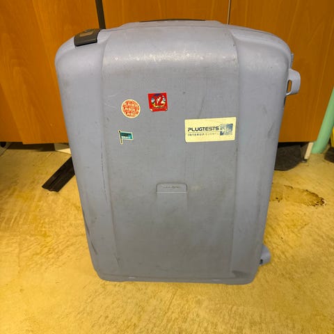 Harmaa Samsoniten keskikokoinen matkalaukku tarjolla uuteen kotiin. Ehjä, mutta ulkopinnassa on käytöstä tulleita jälkiä. Sisältä siisti. Avain tulee mukaan. Kahvan alla on myös numerolukko. Neljä pyörää, liikkuu hyvin. Vetokahva toimii hyvin.