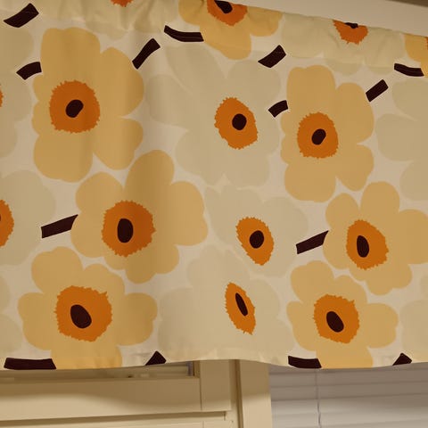 Väritykseltään beige /luonnon valk. /tumman vihreä(näyttää mustalta). Verhokappa on korkeudeltaan 59 cm,josta tankokujan osuus on 9 cm,leveys on 208 cm.