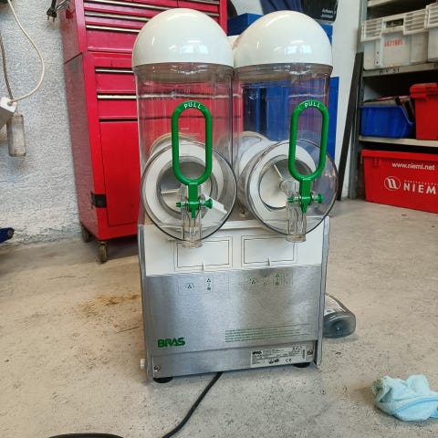 Slush-kone juomajäähdytin, jossa on suuri läpinäkyvä säiliö ja etupuolella hana juoman annosteluun. Laitteessa on alhaalla jäähdytysyksikkö ja säiliön päällä kansi. Soveltuu esimerkiksi mehujen, jääjuomien tai slush-juomien valmistukseen ja tarjoiluun. Laite on tarkoitettu käytettäväksi sisätiloissa tasaisella alustalla ja se vaatii verkkovirtaan kytkennän.