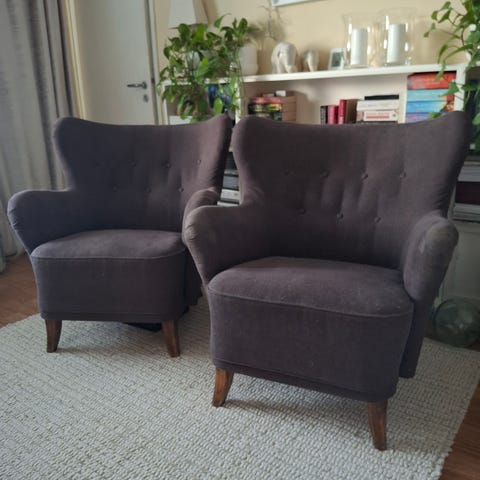 Verhoilijamestarin peruskorjaamat lehmäntaljalla pääystetyt nojatuolit.