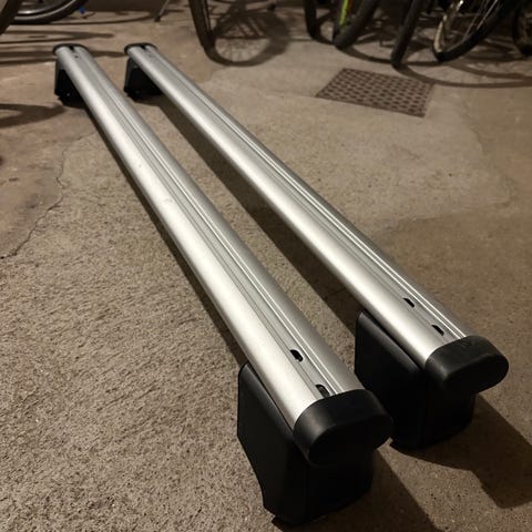 Audi kattotelineet, valmistettu alumiinista. Sopivat auton kattokaiteisiin kiinnitettäväksi. Väri hopea mustilla päillä.