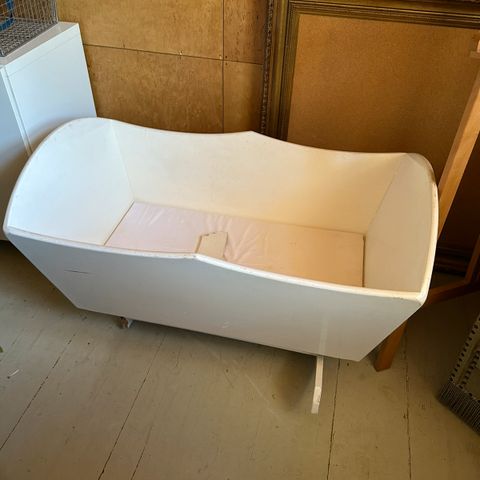 Tummanharmaa sänkykehikko joka on vähän liian iso pieneen asuntoon. Siihen parhaiten menee patja joka on suunnilleen 140cm leveä ja 200 cm pitkä. Siinä on myös alla säilytystila. Kaksi sen puulaudoista on korjattu teipillä, mutta se ei huomaavasti vaikuta kehikon käyttöön. Tällä hetkellä paloina koska se on kokonaisena liian iso kuljettaa. Ei sisällä patjaa, vain kehikon.