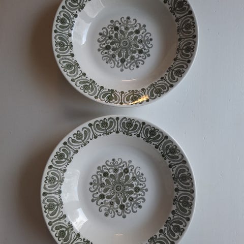 Kaksi kuvan mukaista vanhaa Arabian lautasta settinä. Valkoinen lautanen, reunoilla keltainen ja musta raita. Käytön myötä reunojen värit haalistuneet. Reunoilla muutenkin käytön jälkiä hieman, näkyy kuvissa. Ei lohkeamia kuitenkaan. 2kpl lautasia settinä postikuluineen 13e.