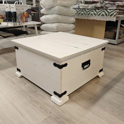 Männystä valmistettu Linnea arkkupöytä, johon ollaan itse lisätty pyörät alle helpompaa siirtämistä varten. Sisälle saa näppärästi säilöttyä vaikka vilttejä, sohvatyynyjä ja miksei vaikka pehmoleluja. On meillä toiminut sohvapöytänä mutta nyt tilanpuutteen vuoksi myyntiin.