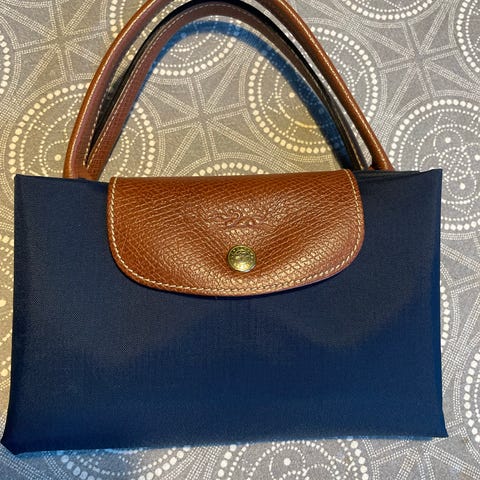 Longchamp kangaslaukku naisille. Laukku on valmistettu kankaasta, ja siinä on ruskeat kantokahvat sekä läppäosa, joissa on tikkaukset ja metallinen nepparikiinnitys. Laukussa on vetoketju ja neppari yläosassa. Väri on musta kangasosassa ja ruskea yksityiskohdissa. Soveltuu arkilaukuksi tai asiointilaukuksi, jossa on tilaa perusesineille kuten lompakolle, puhelimelle ja pienille tavaroille.