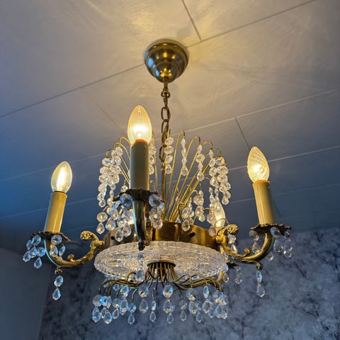 Hieno koristeellinen arvokkuutta henkivä kristallikruunu kaunista kotiasi koristamaan ja valaisemaan edullisesti 50 eurolla. Voin myös lähettää valaisimen hyvin pakattuina kuljetuskustannuksia vastaan.