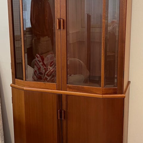Kaunis vanha vitriini lasiovilla. Jonkin verran patinaa ja ikä näkyy. Ovet aukeavat moitteetta, sisältä siisti ja hajuton.