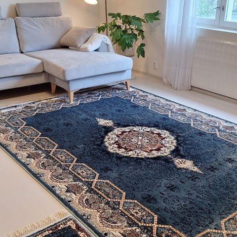 Tämä näyttävä, runsaskuvioinen matto toimii olohuoneen todellisena katseenvangitsijana. Syvät punaisen ja tumman sävyt yhdistettynä sinertäviin yksityiskohtiin tuovat tilaan lämpöä, persoonallisuutta ja arvokasta ilmettä. Sopii täydellisesti niin moderniin kuin klassiseenkin sisustukseen.