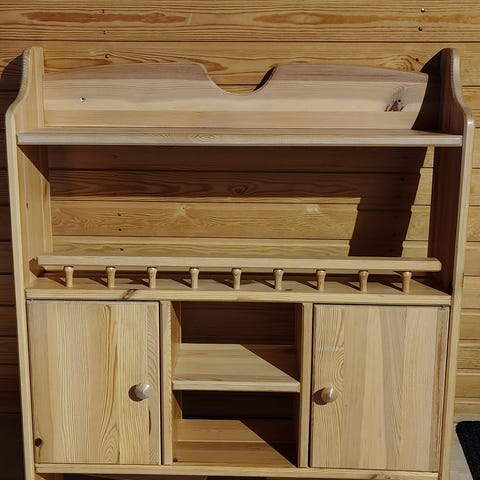 Puuinen seinäkaappi, jossa yksi ovi ja kaksi hyllytasoa. Kaapissa on metalliset koristeelliset saranat ja rengasvedin. Soveltuu esimerkiksi pientavaroiden säilytykseen seinälle kiinnitettynä, esimerkiksi eteiseen, keittiöön tai mökille.
