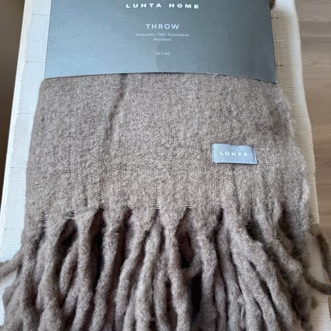 Käyttämätön Luhta Home torkkupeite värissä Taupe. Koko 150x120. Materiaali 38% villaa, 43% akryyli, 17% polyamidi ja 8% polyesteri.