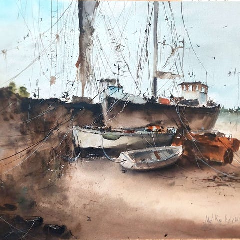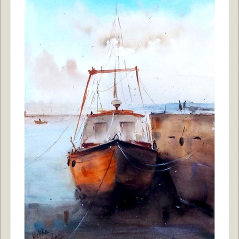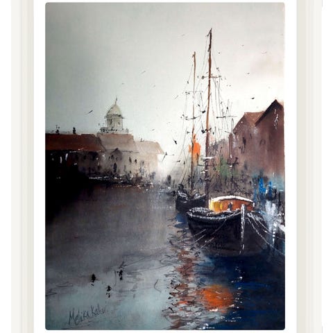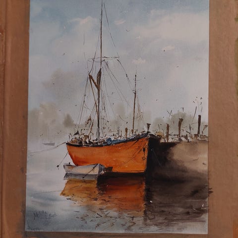 Veneaiheinen akvarellimaalaus satamasta