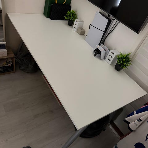 Valkoinen työpöytä. Erittäin vakaa, valkoiset teräsjalakset. Avattava lokero esim.johdoille ja 2 laatikkoa.
