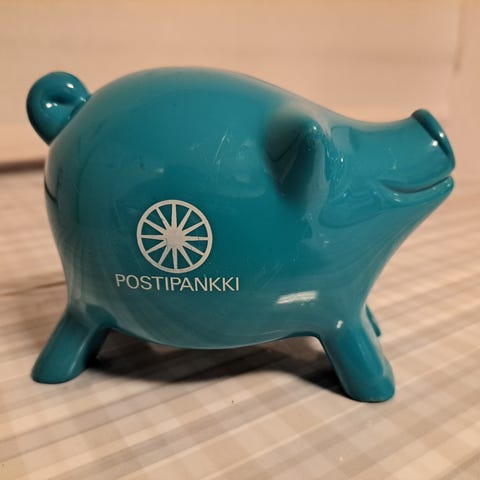 Myydään kaksi ehjää Postipankki -säästöpossua, punainen ja kellastuneen valkoinen.